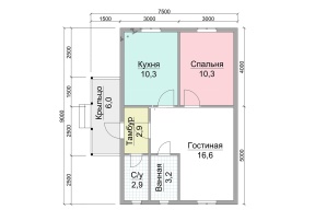 Размеры дома – 6х9 м.. Внутренние помещения соединяются межкомнатными дверьми филенчатого типа. Стены возведены из строганного бруса с прокладкой джутового льнополотна. Перекрытие произведено из обрезной доски с последующим использованием ондулина в качестве кровельного материала. Крыша двускатная. Обрешетка выполнена с помощью полуобрезной доски. Монтирование полов включает два этапа: укладка чернового слоя, а затем чистового.